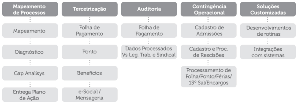 - Entrega de obrigações acessórias mensais (eSocial, FGTS, etc.) e anuais (DIRF, RAIS, etc.)